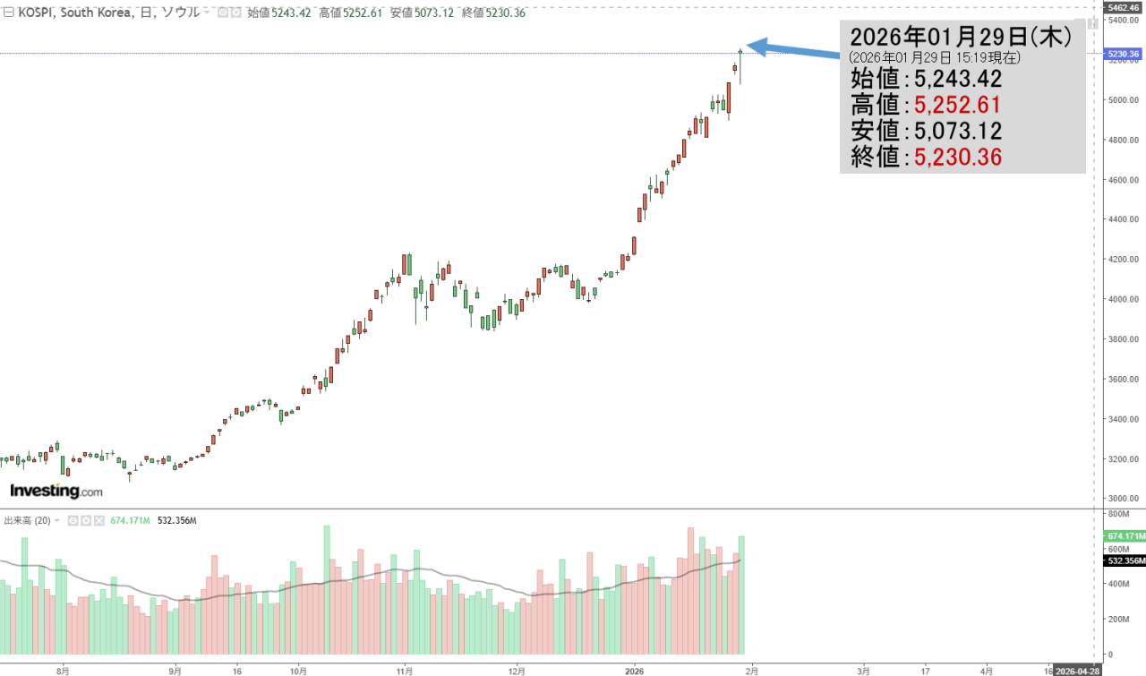 2026年01月29日(木)の韓国株式市場が締まりました。15:19現在、KOSPI(韓国総合株価指数)のチャートは以下のようになっています(チャートは『Investing.com』より引用)。