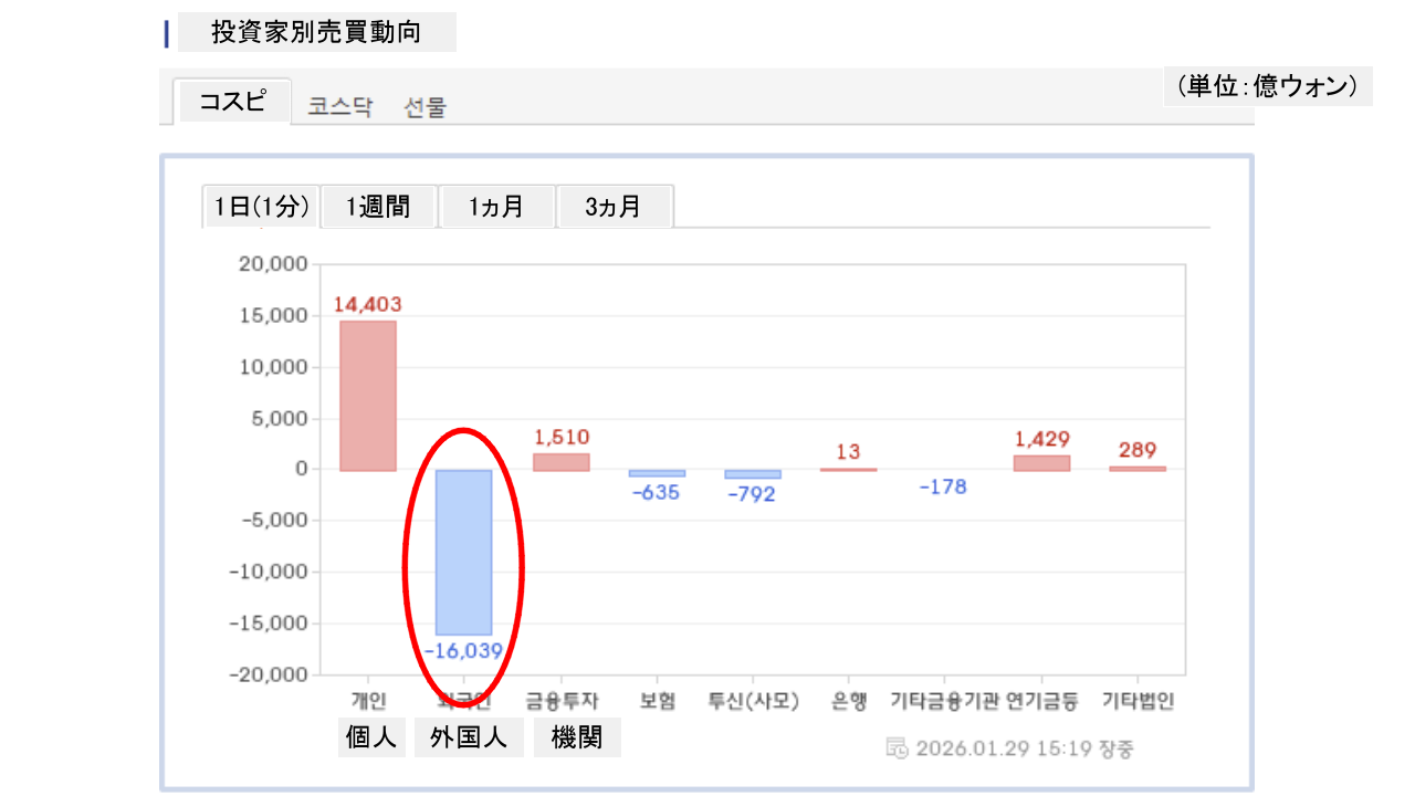 個人投資家は「1兆4,403億ウォン」の買い越し、外国人投資家は「1兆6,039億ウォン」の売り越し、そして機関投資家は「1,510億ウォン」の買い越しです。
