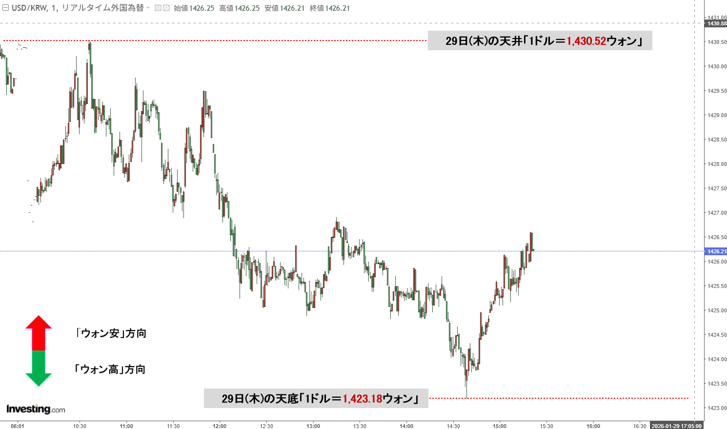 2026年01月29日(木)の韓国時間※が終わりました。15:20現在、ドルウォンのチャートは以下のようになっています(チャートは『Investing.com』より引用)。