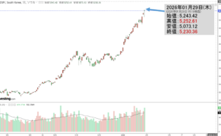 デブ猫日記 「韓国株式市場」29日(木)決着・KOSPI「5,230」 2026年01月29日(木)の韓国株式市場が締まりました。15:19現在、KOSPI(韓国総合株価指数)のチャートは以下のようになっています(チャートは『Investing.com』より引用)。 投資家別売買動向は以下です。 ⇒データ引用元... 2026.01.29 デブ猫日記