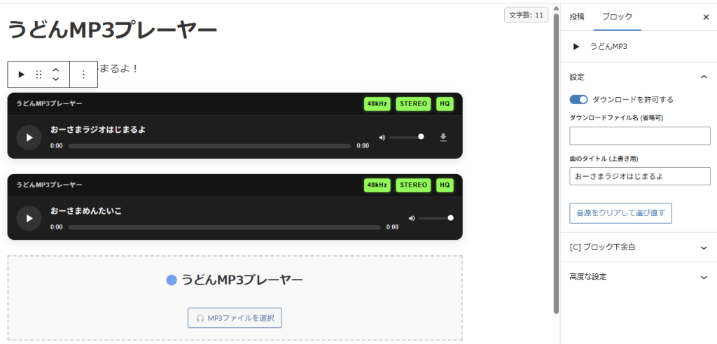 ※WordPress6.9.1用です。メディア登録されたMP3をそのまま流すだけです。自分利用用に作ったのでノークレームノーリターンでおねがいします。ブロックエディター推奨。新規プラグインのインストールでZIPをそのままアップロードしてください。設定⇒うどんMP3にてプレーヤーの名称と色味パターンを選択できます。