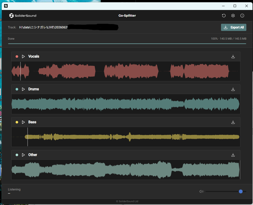 試しに、課題曲を分離。ギターはOtherに入っておりました。良い感じ。各stemを個別に保存もできるし、まとめて保存することも可能です。